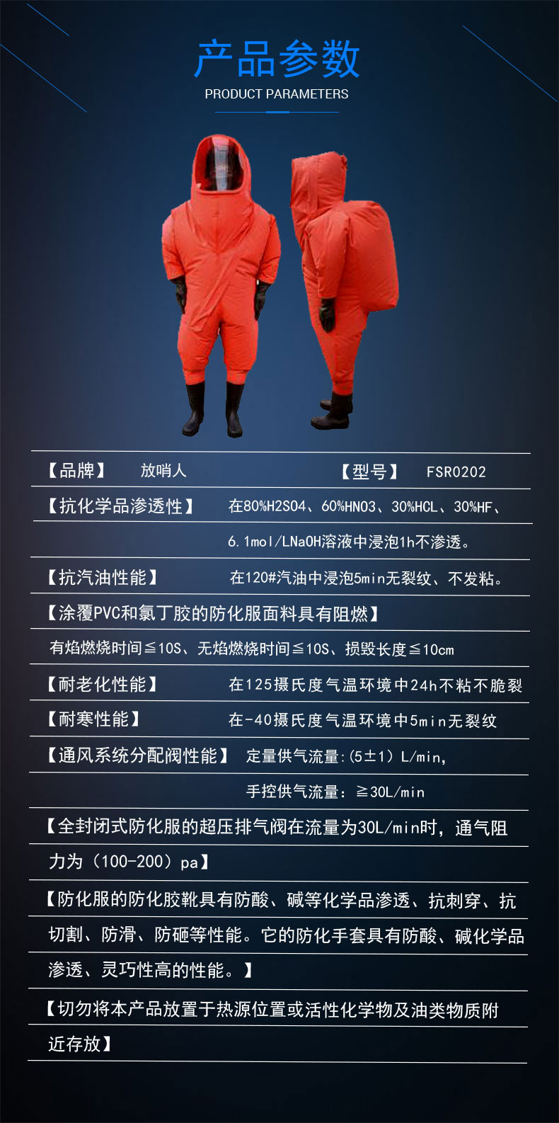 本公司生產的RFH-02氣密型(重型)防化服,都經過嚴格測試,確保符合BS EN943-1:2002 的歐洲標準,所采用的材料也經過嚴格測試,保證符合BS EN943-1:2002 中相關條款的要求。