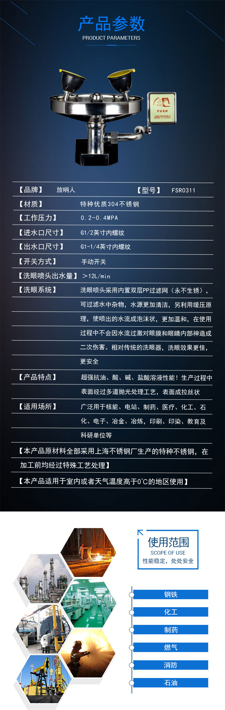 開關(guān)方式:手動(dòng),使用洗眼功能時(shí)只需用手輕推手推閥,清潔的水從洗眼噴頭自動(dòng)噴出。洗眼噴頭內(nèi)置雙層過濾網(wǎng),過濾水中雜質(zhì),使水流成泡沫狀水柱,有效防止水中雜質(zhì)或因水流過激而對(duì)傷者眼部神經(jīng)和受傷部位造成二次傷害,噴頭外設(shè)防塵蓋,使用時(shí)可隨水流自動(dòng)沖開。用好后將防塵蓋復(fù)位。