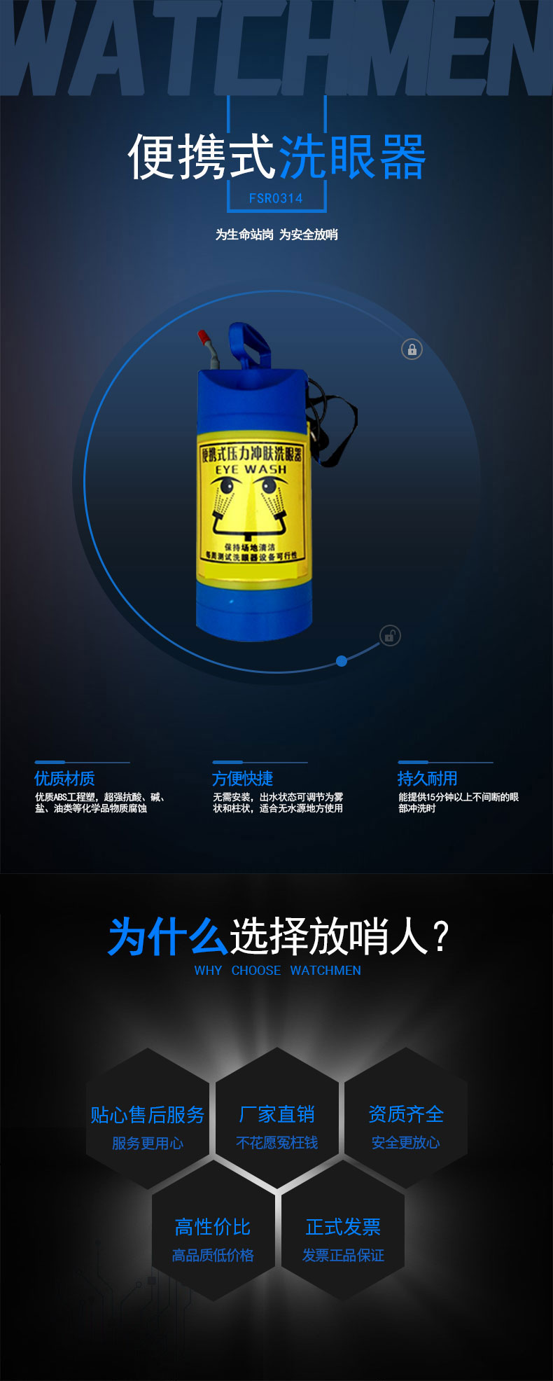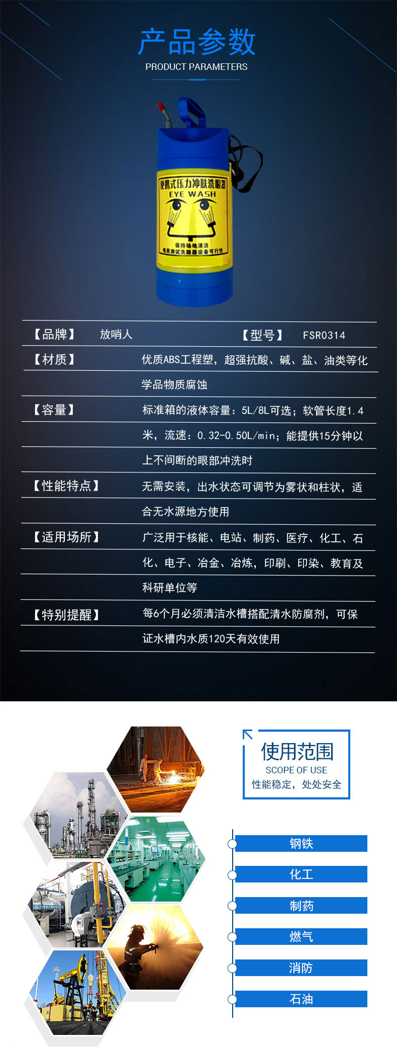 容量:標準箱的液體容量:5L/8L可選;軟管長度1.4米,流速:0.32-0.50L/min;能提供15分鐘以上不間斷的眼部沖洗時間