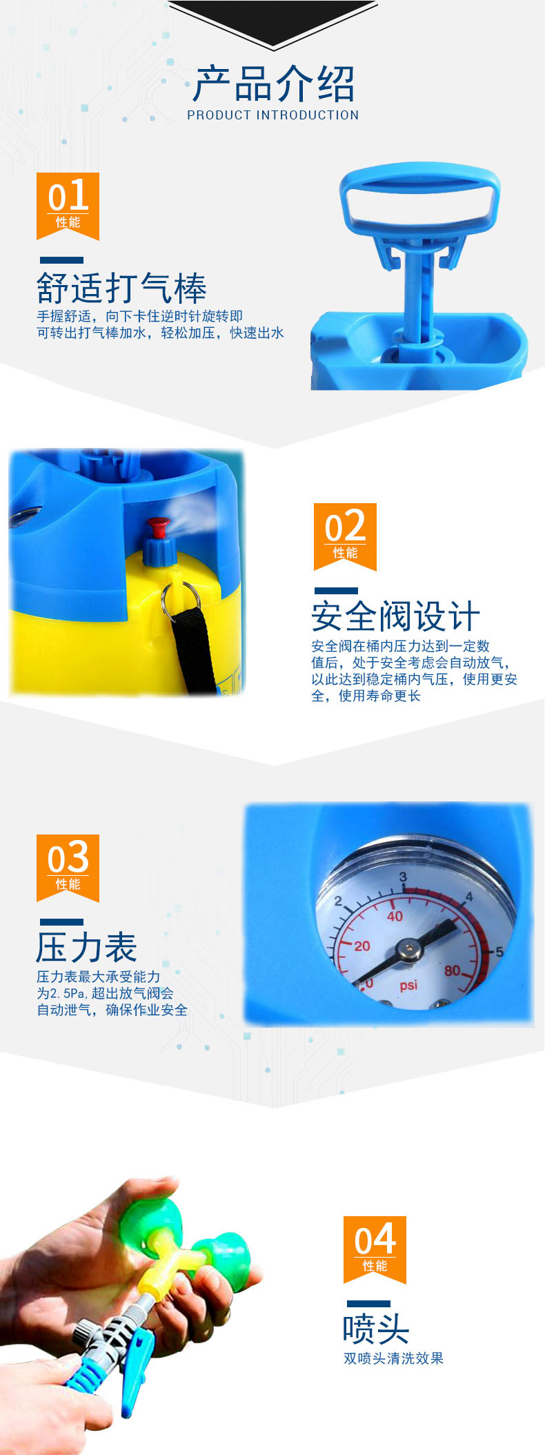 性能特點:無需安裝,出水狀態可調節為霧狀和柱狀,適合無水源地方使用。