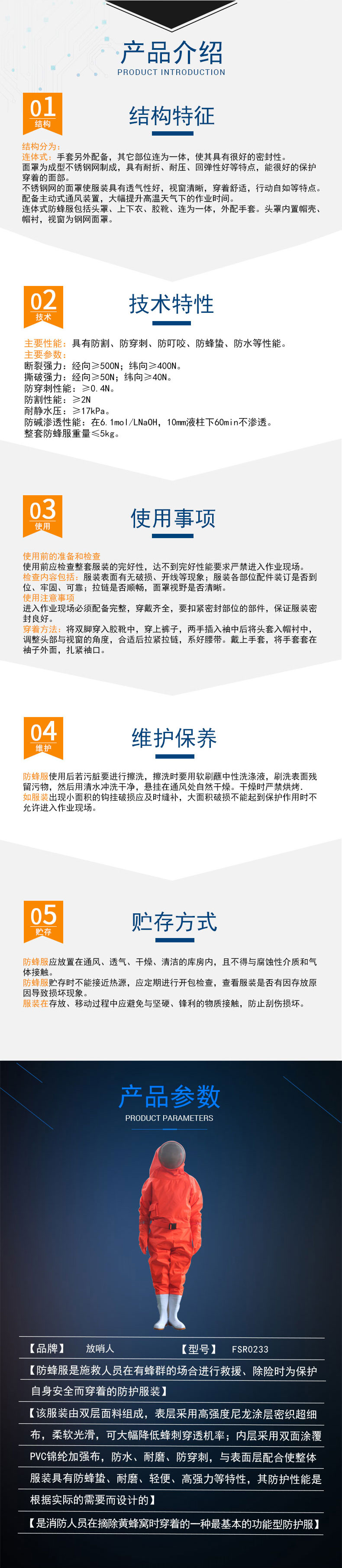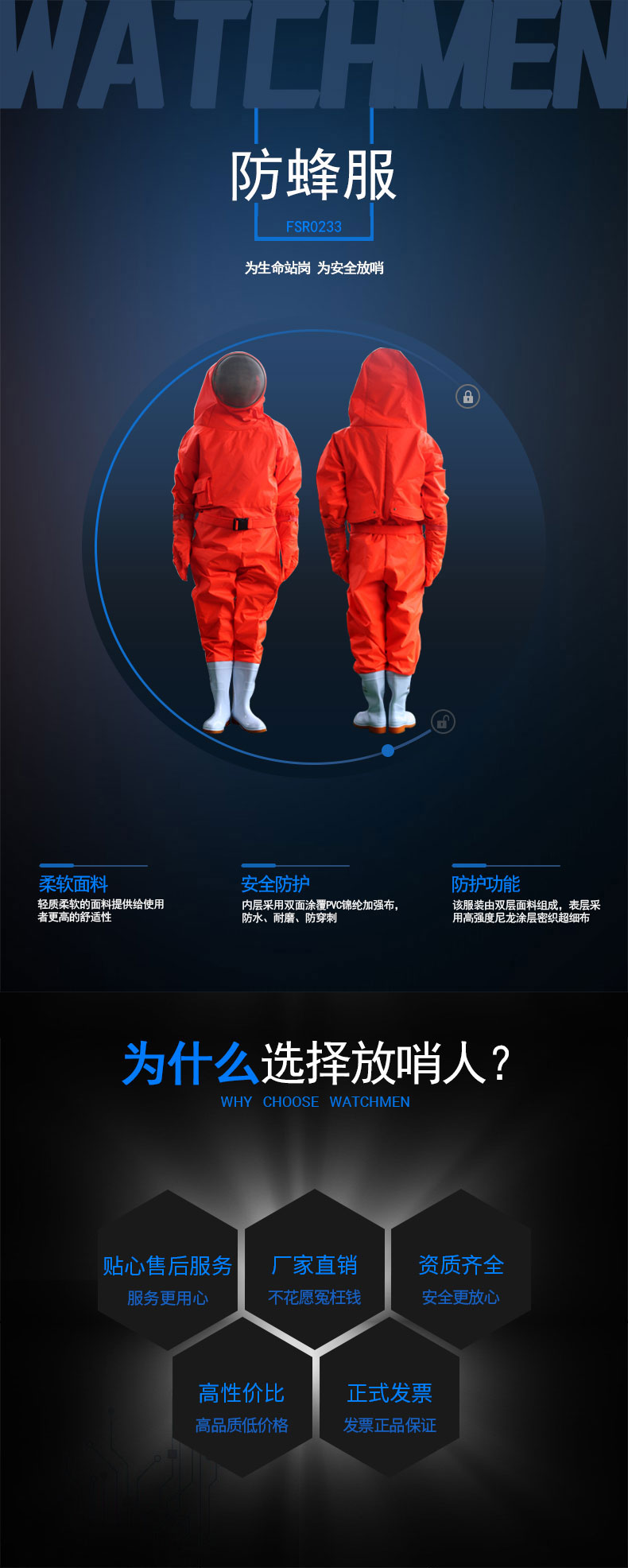 防蜂服是施救人員在有蜂群的場合進行救援、除險時為保護自身安全而穿著的防護服裝。該服裝由雙層面料組成,具有密封、耐磨、輕便、高強力等特性,其防護性能是根據實際的需要而設計的。是消防人員在摘除黃蜂窩時穿著的一種最基本的功能型防護服。