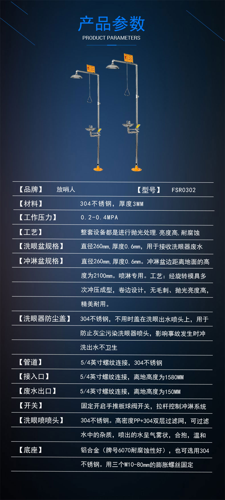 15、功能:用于石油、化工、飲料、醫藥等行業,當發生化學液體、有毒有害物質、以及火災噴濺到工作人員身體、臉部、眼睛時迅速沖洗降低