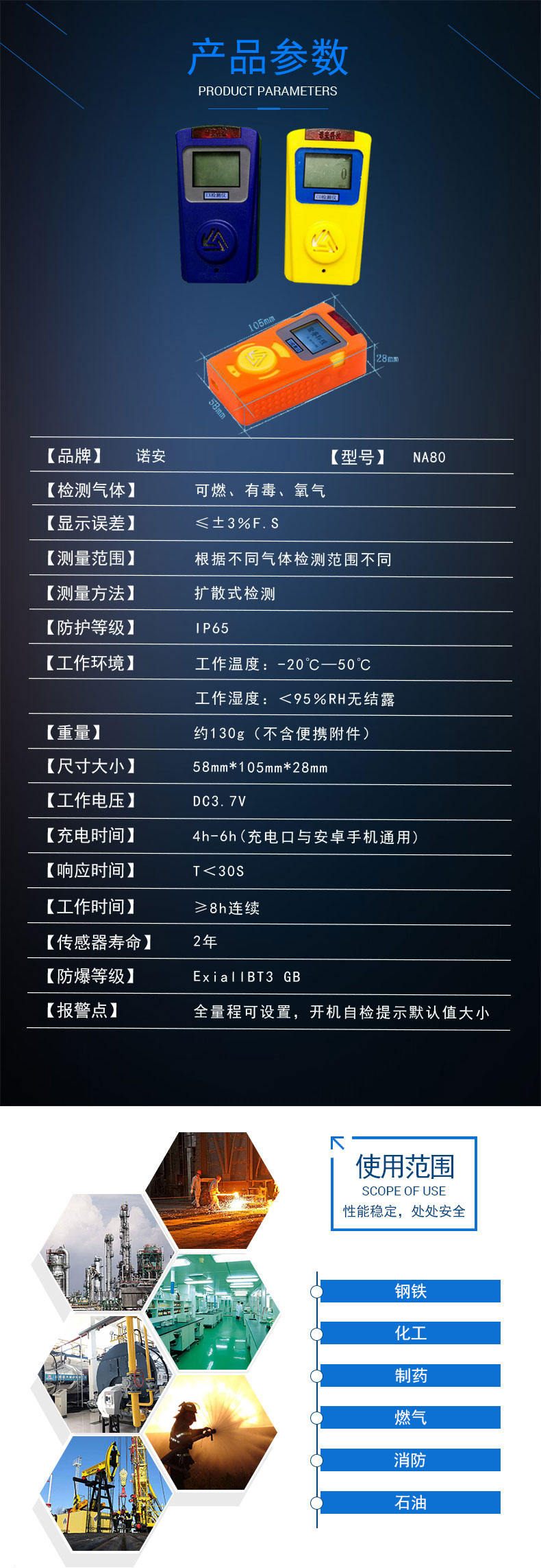 NA-80 (以下簡稱探測器),是一種可連續檢測氣體濃度本質安全型設備。它適用于防爆場所氣體泄漏搶險,地下管道或礦井等場所,能有效保證工作人員的生命安全不受侵害,生產設備不受損失。
